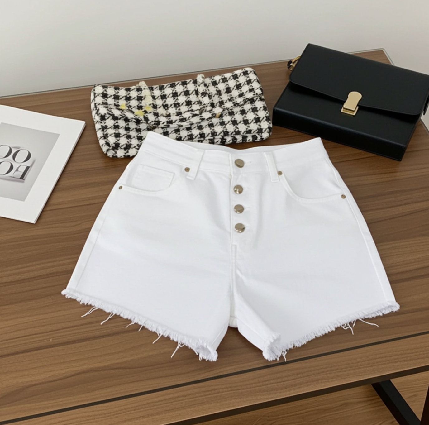 Pantaloni Scurți Denim cu Talie Înaltă - Shorts Clasici cu Terminație Franjurată